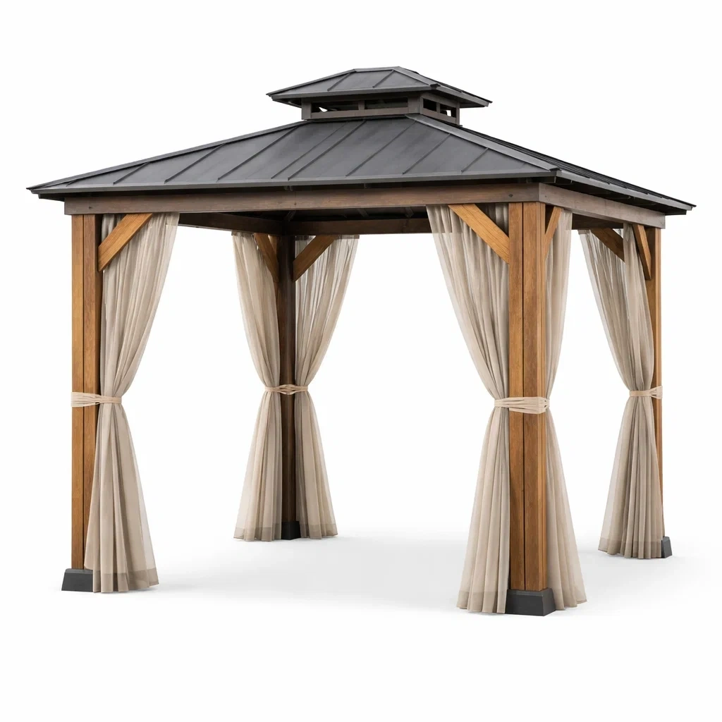 Materiale: Struttura in legno massello; tetto in metallo zincato; tende in tessuto di poliestere